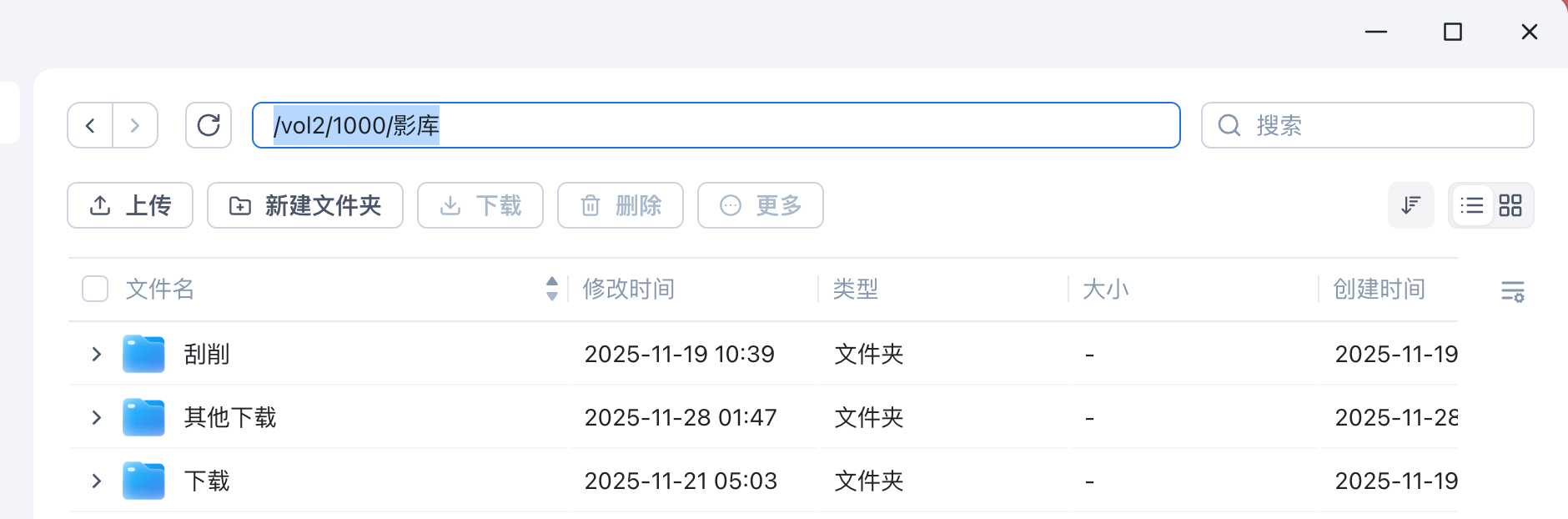 在计划存放影视文件的磁盘(例如 /vol2/1000)下创建一个总目录 /影库,然后在其中按用途再细分两个一级目录:
